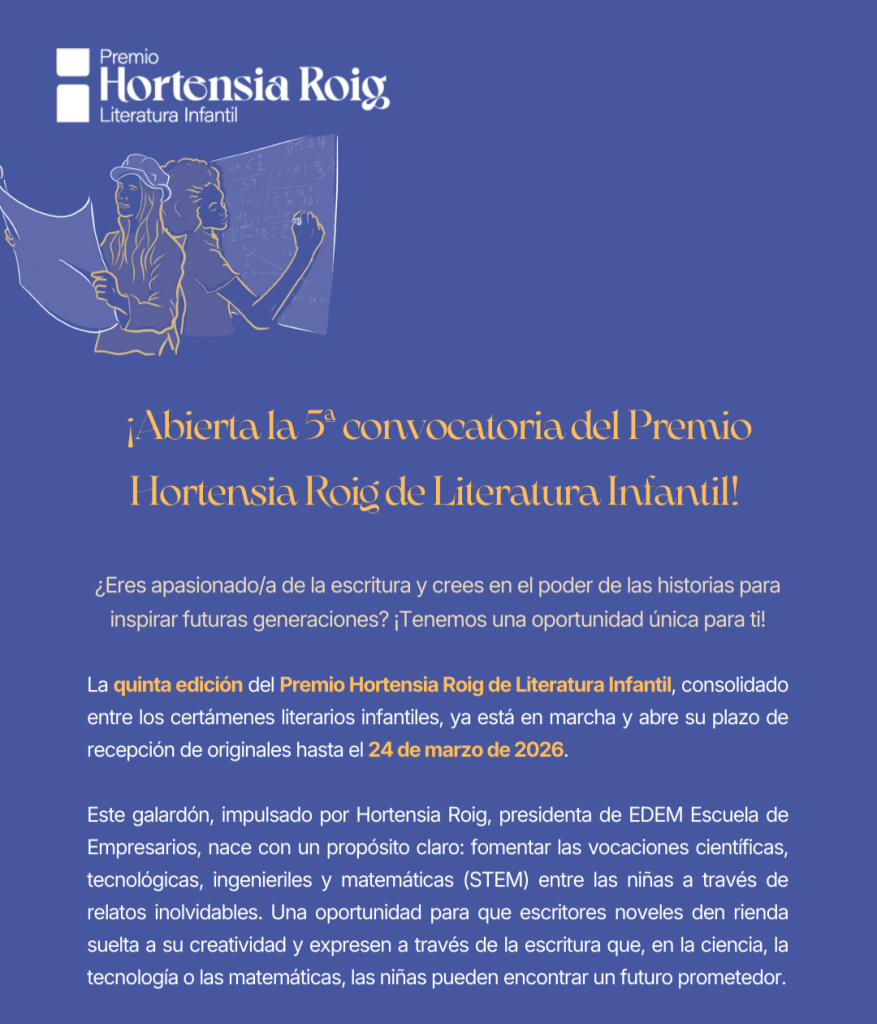 Buscamos textos que favorezcan las vocaciones científicas y técnicas entre lectoras de 8 a 10 años. La temática será libre pero los textos deberán estar protagonizados por niñas o mujeres, bien relevantes personalidades históricas, bien personajes de ficción. La extensión oscilará entre las 35 y 50 páginas en formato DIN-A4. ¡Anímate a escribir! Puedes presentarte si eres mayor de 18 años de nacionalidad española y/o residente en España. Tienes tiempo hasta el 24 de marzo de 2026. El veredicto se dará a conocer en el mes de octubre.